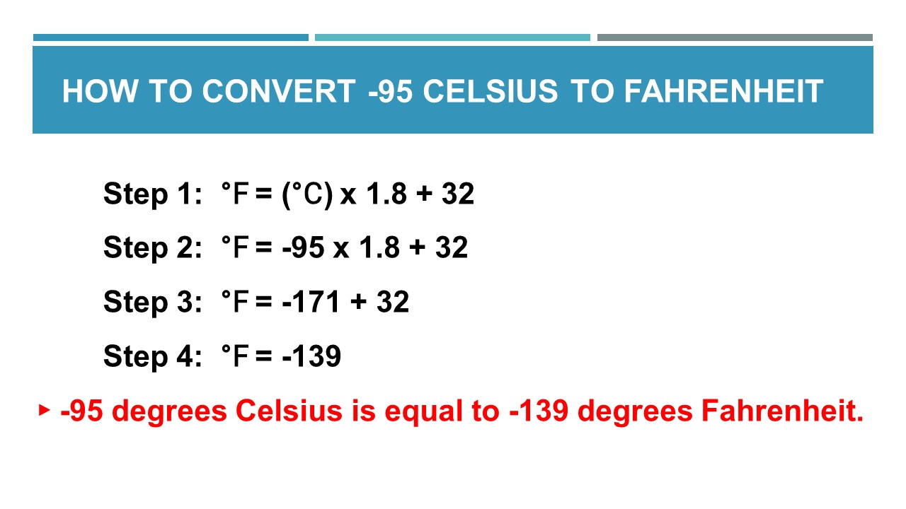 You can utilize the post-obit math to catechumen -95 degrees Celsius to Fahrenheit.